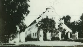 Bild: Die Rittermäßige Scholtisei Neuwalde (Ort: Neuwalde polnisch: Nowy Las) in Oberschlesien, nahe der heutigen polnisch-tschechischen Grenze. Am Eingang der Scholtisei war das Allnoch-Wappen angebracht.